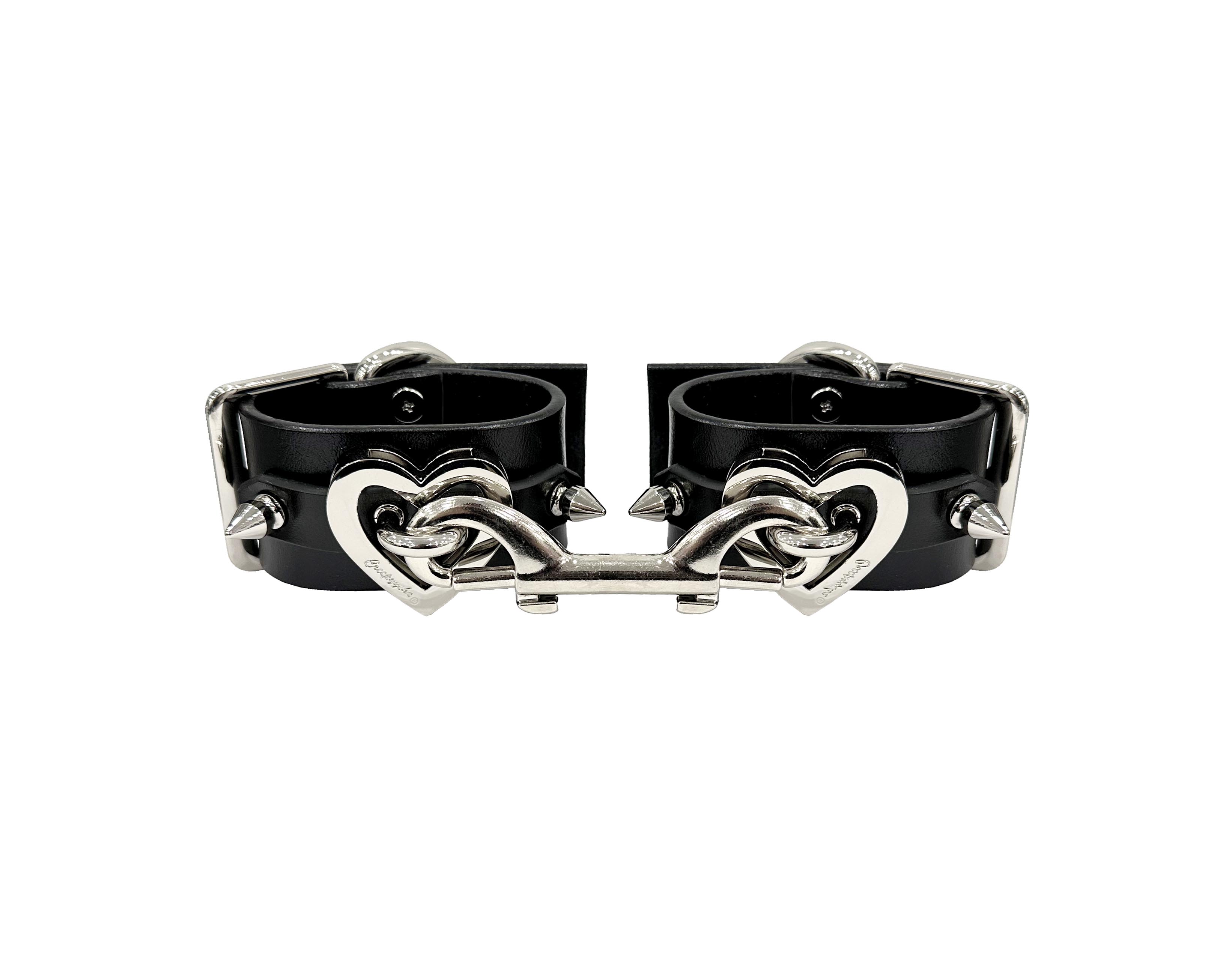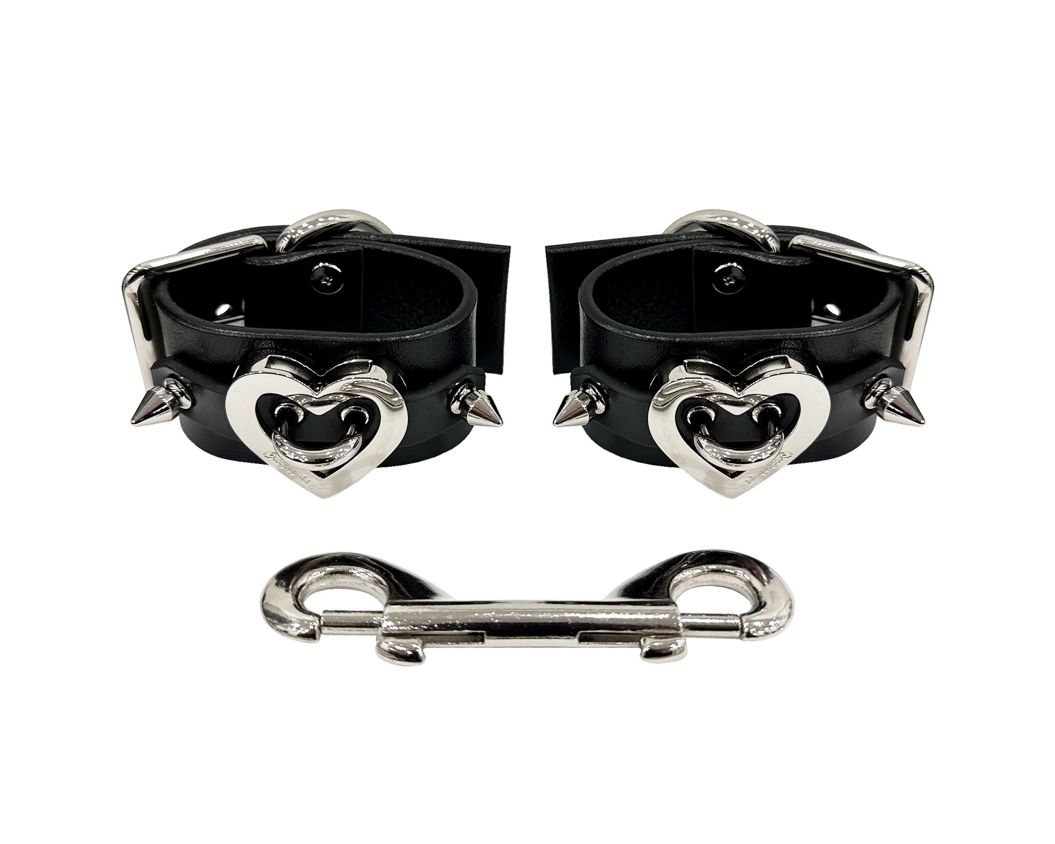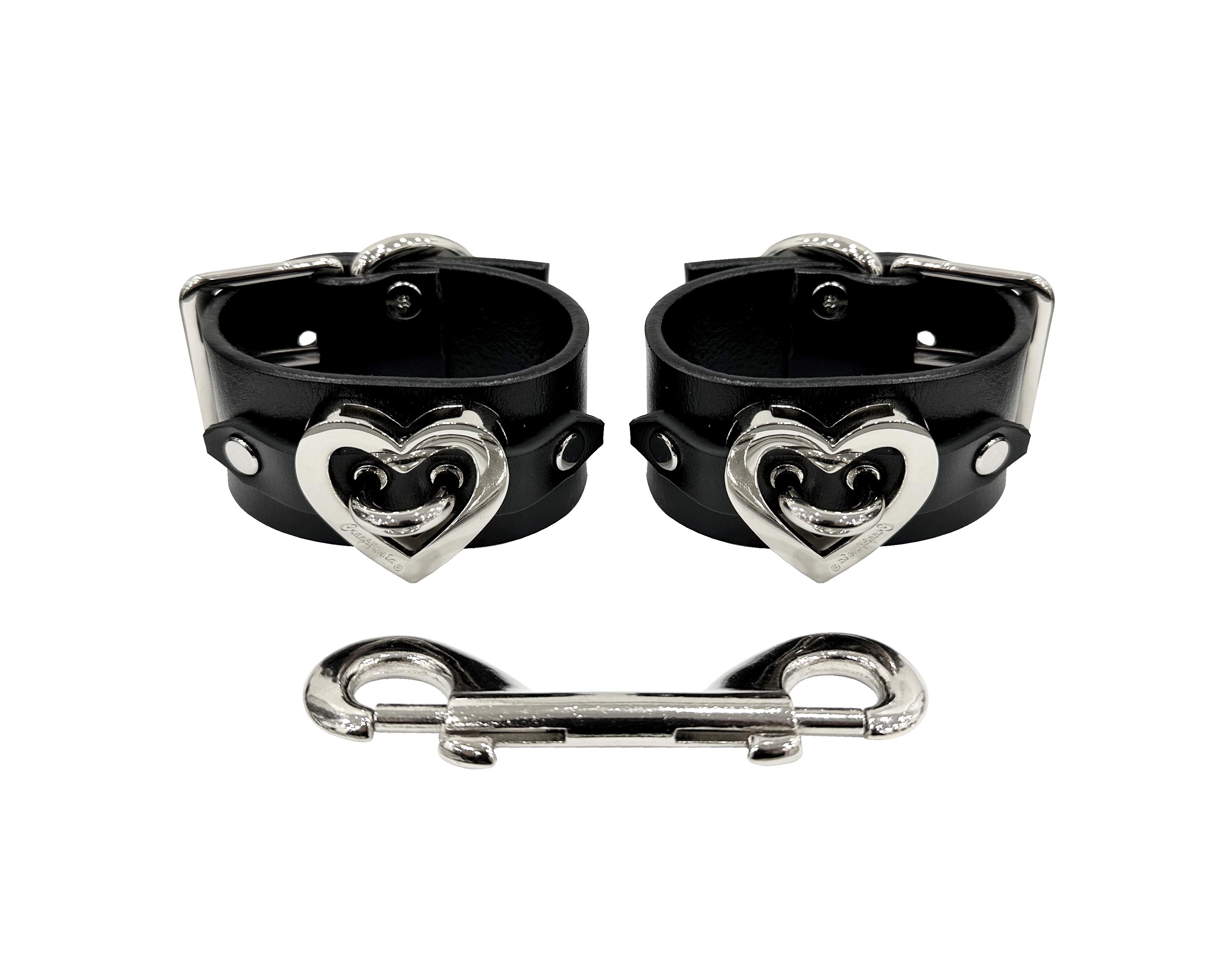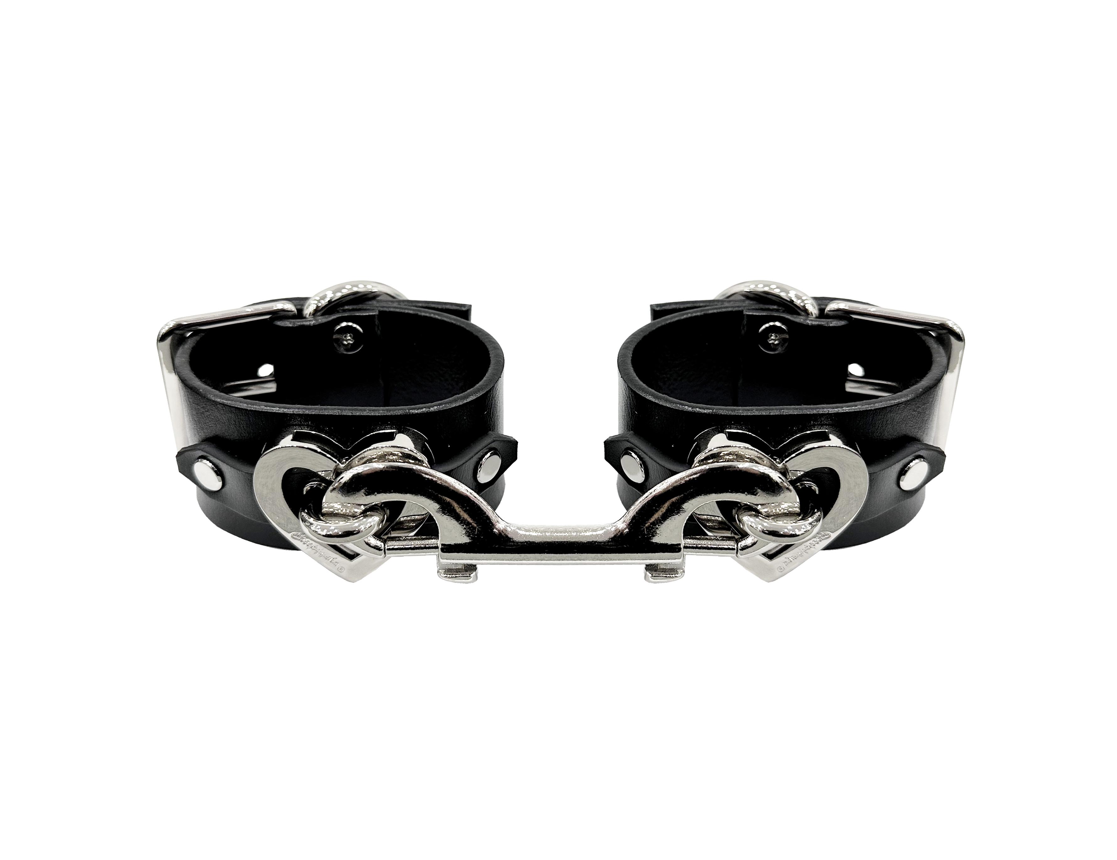 Pair of leather cuffs with heart hardware and connector